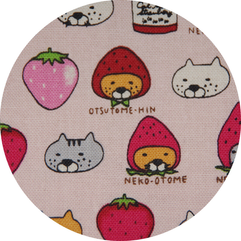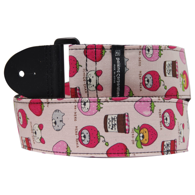 ギターストラップいちご猫 2026.01.09 DGS-IGN32 JAN4571694380885 Daiking自社工房にて製造するギターストラップ、いちご猫。日本製の生地を使用しています。ギター本体をキズつけにくくするために日本製YKK製プラスチックパーツを使用しています。エンド革には牛本革を使用。合皮のエンドよりも突然の切れが減ります。裏地のテープには日本製のPPテープを使用しています。