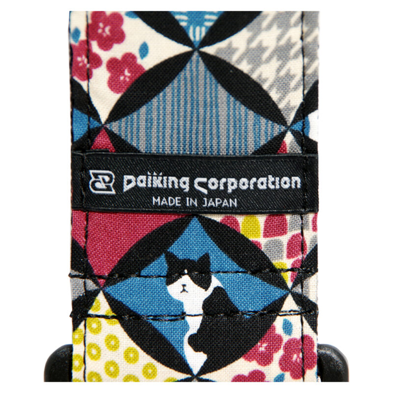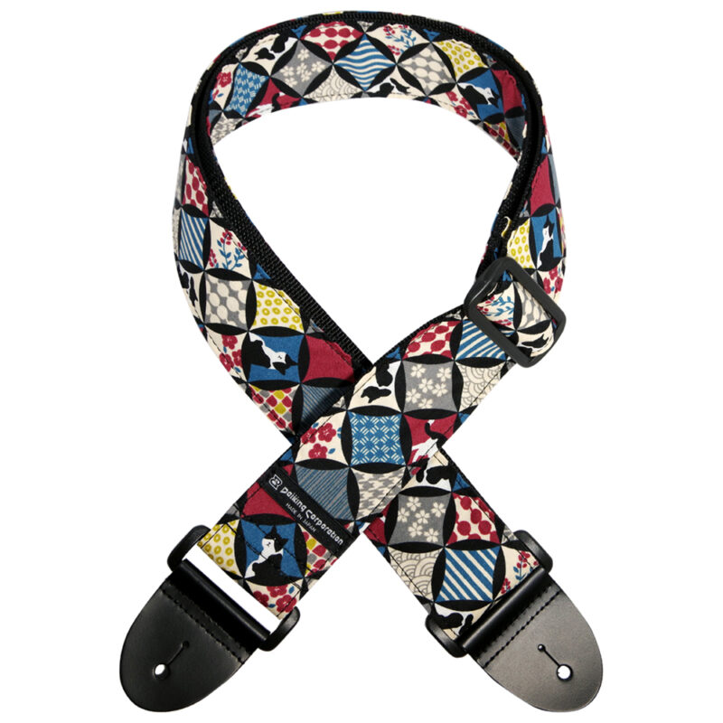 ギターストラップ七宝猫 2025.03.30 DGS-SPT JAN4560452459338 Daiking自社工房にて製造するギターストラップ、猫三昧。日本製の生地を使用しています。ギター本体をキズつけにくくするために日本製YKK製プラスチックパーツを使用しています。エンド革には牛本革を使用。合皮のエンドよりも突然の切れが減ります。裏地のテープには日本製のPPテープを使用しています。