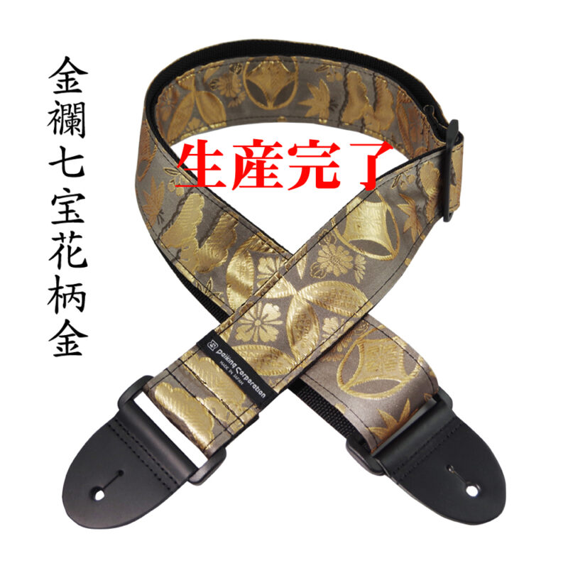 金糸や銀糸、金箔や銀箔を織り込み模様が浮き出るように織った織物「金襴」。京都の西陣を主産地に織り継がれた織物です。その西陣織りの生地を大胆に表地に使用したギターストラップです。もちろん、弊社工房にて完全ハンドメイドで生産しております。日本製の材料と日本製の生地で日本の工房で日本の職人が製造する完全日本製のギターストラップです。素材にはポリエステルを使用することにより耐久性があり、コスト的にも幅広いユーザー様に対応しております。