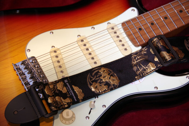 西陣織りギターストラップDGS-NKH60″金花丸” 希望小売価格6,600円 JAN4571694380557 2025.06.06 京都で生産される西陣織りの生地を使用したギターストラップです。自社工房にて製造しています。 長さ=約80cm-約138cm 幅5cm