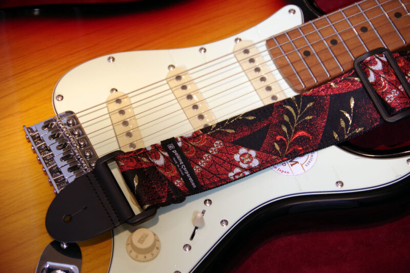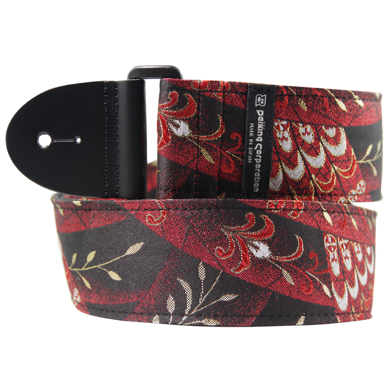 西陣織りギターストラップDGS-NKHA60″金襴赤羽根重ね” 希望小売価格6,600円 2025.10.30 京都で生産される西陣織りの生地を使用したギターストラップです。自社工房にて製造しています。 長さ=約80cm-約138cm 幅5cm