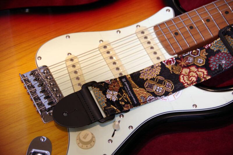 西陣織りギターストラップDGS-NKKH60″金欄亀甲百花柄” 希望小売価格6,600円 JAN4571694380694 2025.09.22 京都で生産される西陣織りの生地を使用したギターストラップです。自社工房にて製造しています。 長さ=約80cm-約138cm 幅5cm