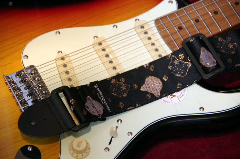 西陣織りギターストラップDGS-NKN60″金欄猫伝統柄” 希望小売価格6,600円 JAN4571694380649 2025.07.02 京都で生産される西陣織りの生地を使用したギターストラップです。自社工房にて製造しています。 長さ=約80cm-約138cm 幅5cm