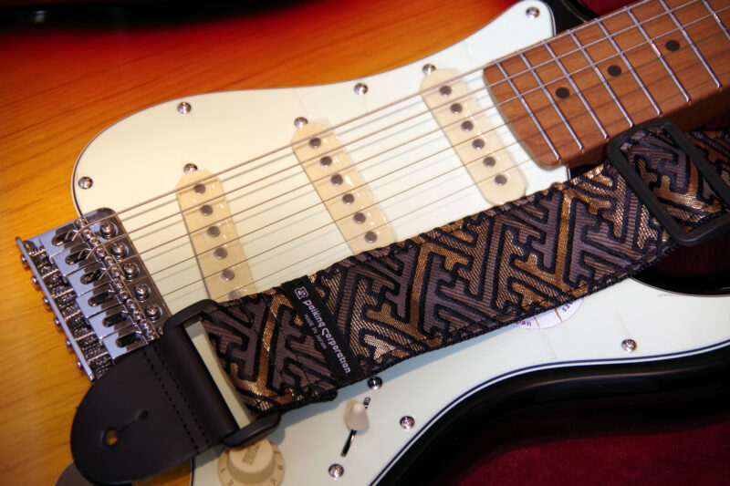 西陣織りギターストラップDGS-NKS60″紗綾形金灰” 希望小売価格6,600円 JAN4571694380540 2025.06.06 京都で生産される西陣織りの生地を使用したギターストラップです。自社工房にて製造しています。 長さ=約80cm-約138cm 幅5cm
