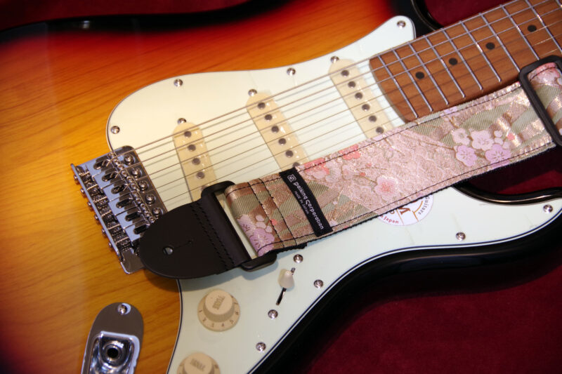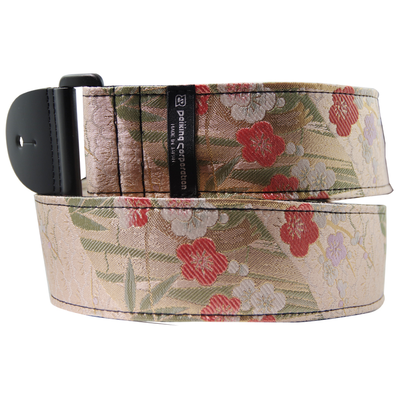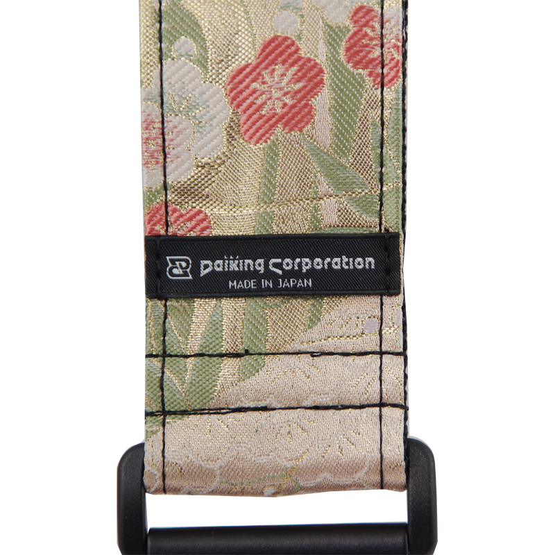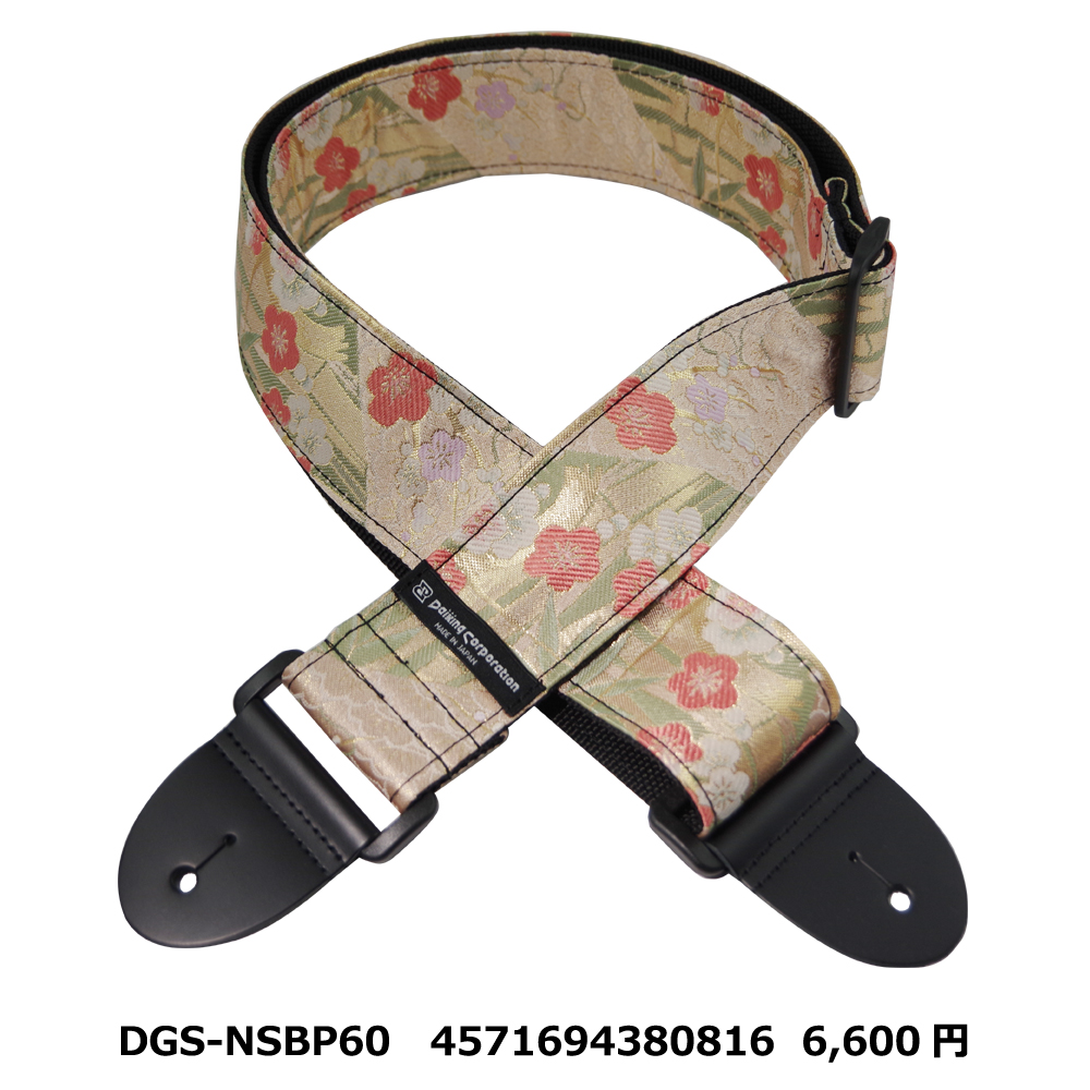 西陣織りギターストラップDGS-NSBP60″金欄松竹梅ピンク柄” 希望小売価格6,600円 2025.10.30 京都で生産される西陣織りの生地を使用したギターストラップです。自社工房にて製造しています。 長さ=約80cm-約138cm 幅5cm